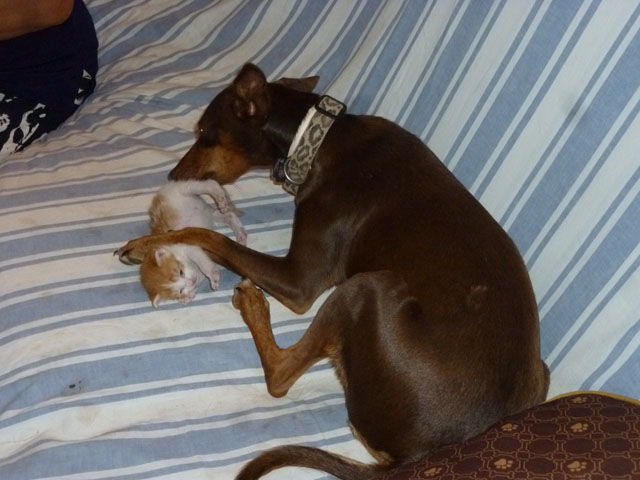 La maman des chatons est morte alors qu’ils n’avaient que trois jours. Josefina les a pris en charge, leur donnant des petits biberons de lait. Une chienne, à l’instinct maternel très développé, a pris sous sa coupe la portée. Un petit chiot ayant été trouvé abandonné un peu plus loin dans l’ile, a été ajouté à la portée.